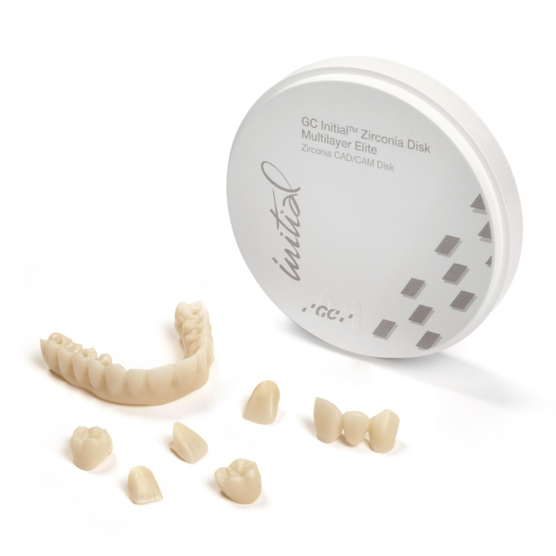 Les GC Initial Zirconia Disk Multilayer Elite sont disponibles en 16 teintes V et les 3 types bleach, en disques de 14, 16, 20 et 25 mm d'épaisseur et 98,5 mm de diamètre.
