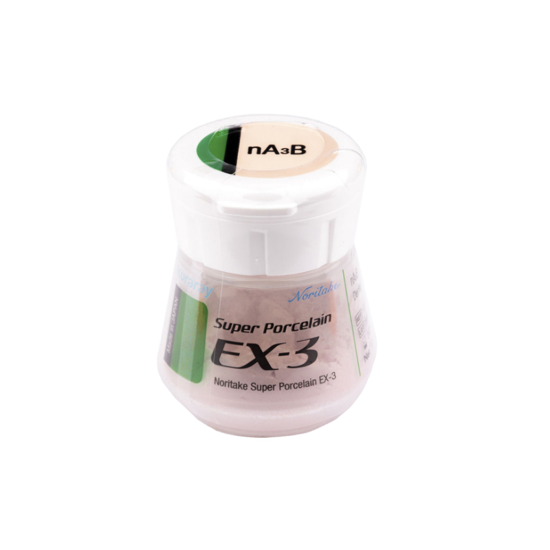 Céramique ceramo-metal EX3 SUPER PORCELAINE NORITAKE Les procédures de fabrication de la NORITAKE SUPER PORCELAIN EX-3 sont remarquablement faciles. Ses caractéristiques exceptionnelles sont rendues possibles par la taille très fine de ses particules SYNTHETIQUES. Disponible en 16 teintes CLASSICAL VITA® et en teintes BODY VALUE correspondant aux valeurs des teintes 3D master VITA® La céramique NORITAKE SUPER PORCELAIN EX-3 est supérieure aux autres porcelaines dentaires car son coefficient de dilatation thermique (CTE) reste stable lors de cuissons répétées. Par conséquent, lors de la fabrication d'un pont de longue portée, chaque unité peut être personnalisée avec précision et la cuisson répétée de toute la portée avec un risque minimal de fissuration. La céramique EX3 SUPER PORCELAINE NORITAKE est compatible avec les alliages précieux, semi-précieux, non précieux et sans argent pour les prothèses métallo-céramiques. Sa fluorescence est idéale et il est très résistant au verdissement induit par l'argent. Cette combinaison de caractéristiques fait de NORITAKE SUPER PORCELAIN EX-3 un choix idéal pour les restaurations en porcelaine.
