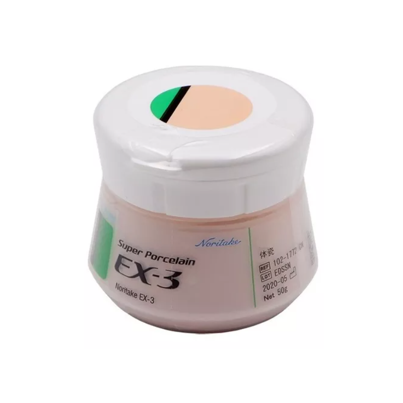 Céramique ceramo-metal EX3 SUPER PORCELAINE NORITAKE Les procédures de fabrication de la NORITAKE SUPER PORCELAIN EX-3 sont remarquablement faciles. Ses caractéristiques exceptionnelles sont rendues possibles par la taille très fine de ses particules SYNTHETIQUES. Disponible en 16 teintes CLASSICAL VITA® et en22 teintes n color Shade (formulées en vue de l'obtention de variantes plus colorées de BODY et PASTE OPAQUE (UNIVERSAL PASTE OPAQUE, OPAQUE poudre).Grâce à l'intensification de la couleur, elle peut même être utilisée dans le cas où l'espace est insuffisant pour la construction de la porcelaine.) La céramique NORITAKE SUPER PORCELAIN EX-3 est supérieure aux autres porcelaines dentaires car son coefficient de dilatation thermique (CTE) reste stable lors de cuissons répétées. Par conséquent, lors de la fabrication d'un pont de longue portée, chaque unité peut être personnalisée avec précision et la cuisson répétée de toute la portée avec un risque minimal de fissuration. La céramique EX3 SUPER PORCELAINE NORITAKE est compatible avec les alliages précieux, semi-précieux, non précieux et sans argent pour les prothèses métallo-céramiques. Sa fluorescence est idéale et il est très résistant au verdissement induit par l'argent. Cette combinaison de caractéristiques fait de NORITAKE SUPER PORCELAIN EX-3 un choix idéal pour les restaurations en porcelaine.